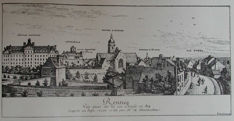 [1814]. Vue prise de la rue Basse, en 1814, d'après un dessin exécuté en 1814 par Mr de Montuchon, reproduction. In BANEAT, Paul. Le Vieux Rennes. Rennes : Plihon et Hommay, [1911].