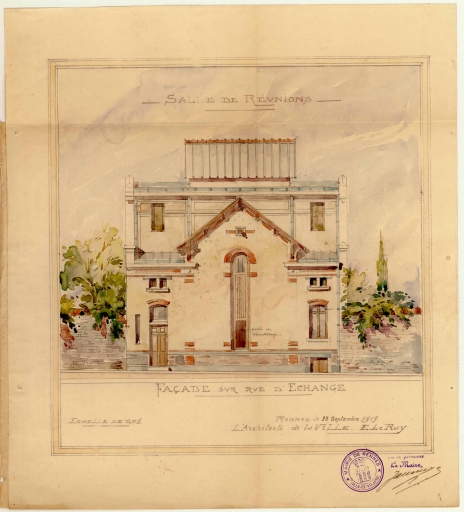 Un projet d´agrandissement et de transformation des locaux est proposé par les architectes de la ville Emmanuel Le Ray et Yves Le Moine, en 1931. Le projet, qui prévoit la construction d´un bâtiment à rez-de-chaussée et étage à la suite du vestibule de la salle des fêtes comprenant des bureaux, et un autre, en bordure de la rue Saint-Louis, à deux étages et comprenant des salles de réunions, ne sera voté qu´en 1935 et réalisé l´année suivante. A cette date, c´est l´architecte Yves Le Moine qui est chargé du projet (réfection de la façade rue d´Echange et des façades sur cour et construction de nouveaux bâtiments rue Saint-Louis) ; il indique dans son devis descriptif que « l´état de vétusté de ces bâtiments est tel que la reconstruction s´impose. D´autre part, une construction neuve permettra un groupement rationnel des locaux suivant leur destination » (1 M 212).