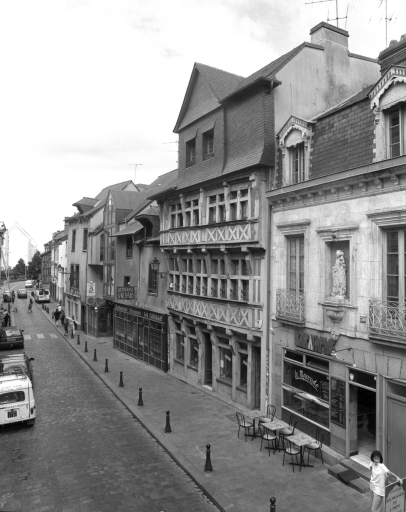 Maison à boutique construite en pan de bois hourdi en torchis. La façade sur rue présente deux étages carrés à fenestrage continu (5 fenêtres au premier étage et 4 fenêtres au deuxième étage) rythmé par des consoles de bois. La toiture à comble rennais, au centre, a été surélevée, au sud.