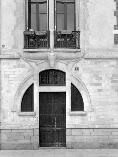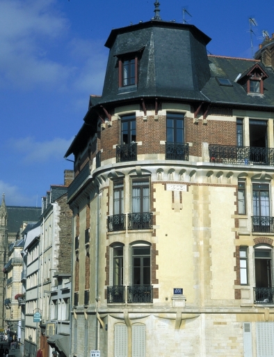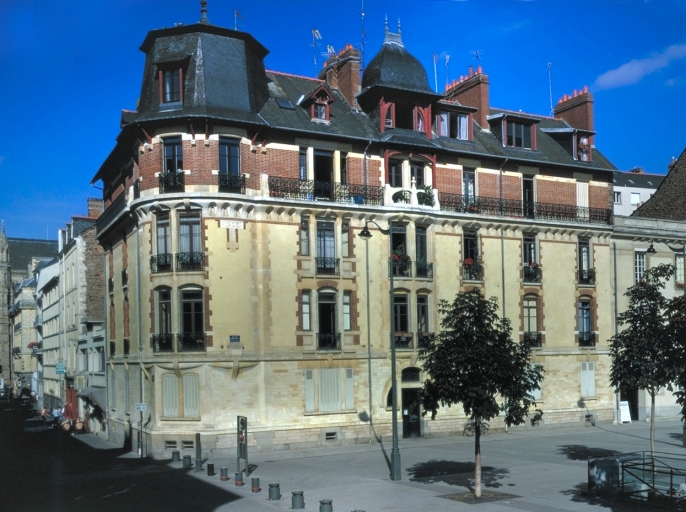 - PINTE Cet immeuble sans parties commerciales est l'une des oeuvres les plus remarquables de Charles Couäsnon, qui y appose sa signature, selon un procédé courant dans le milieu parisien mais rare à Rennes, témoin des influences de l'architecte. Charles Couäsnon utilise ici un répertoire art nouveau auquel sont associés des effets pittoresques issus du premier régionalisme qui puise ses sources dans l'architecture savante, ici les hôtels des Lices. La comparaison avec l'immeuble construit par l'architecte Guillaume, au n° 4 de la place, permet d'observer deux approches qui s'opposent, l'une purement décorative, à la manière d'un drapé, celle de Guillaume, l'autre résolument rationaliste, celle de Couäsnon. Il faut également comprendre ce choix stylistique comme une démarche élitiste qui s'oppose à la production sérielle des immeubles de rapports et qui éclaire sur la clientèle de l'architecte. Construit à l'angle de la rue Saint-Melaine, l'immeuble au traitement d'angle soigné s'inscrit dans le prolongement d'un nouveau site de centralité, celui de la rue Hoche, et dans un site de place, où l'immeuble et la place contribuent l'un et l'autre à une mise en valeur mutuelle.