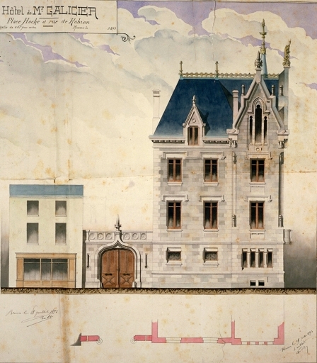 L'hôtel Galicier est l'une des premières oeuvres connues de l'ingénieur rennais, dont il existe une variante rue Thiers. Son originalité réside dans la combinaison entre tradition et modernité. L'ingénieur répond au programme de l'hôtel particulier, qui possède ici une chapelle dans oeuvre, avec des volumes volontairement composites qui évoquent le petit château d'inspiration néogothique. A ces références savantes sont associés des matériaux modernes et préfabriqués, l'enduit en ciment et la terre cuite armée, qui s'opposent, dans leur texture comme dans leur caractère sériel, à l'unicité des matériaux nobles. On retrouve ces éléments d'architecture dans les productions rennaises de l'ingénieur, dont la clientèle est principalement composée de commerçants et d'artisans. Implanté au nord de la place, à l'angle de la rue de Robien, l'édifice traduit également l'ambiguïté de l'espace urbain dans lequel il s'inscrit, un espace résidentiel proche d'un site commerçant.