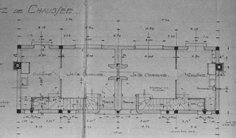 La cité Saint-Martin. Pavillon double. Plan du rez-de-chaussée, plan d'exécution, par Testard du Cosquer, 1937 (A. C. Rennes).