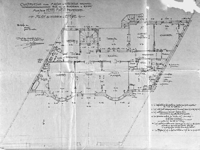 Demeure construite en 1926, sur les plans de l´architecte rennais Eugène Guillaume, pour M. Morin. Les plans (doc. 1 et 2) conservés aux archives communales donnent la distribution projetée de l´édifice. Au rez-de-chaussée se trouvent le vestibule et l'escalier principal, cave, buanderie et remise d'automobile côté rue, chambre des domestiques et deux chambres côté jardin ; à l'ouest l'entrée et l'escalier de service. Au premier étage : une chambre, salon, salle à manger et cuisine côté rue, l'oratoire côté jardin, à l'est, un cabinet de travail et une chambre à l'ouest.