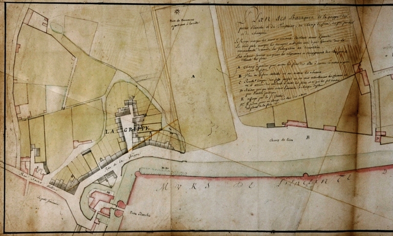 [1720]. Plan des baraques de la Grippe, des Portes-Blanches et de Toussaints, du champ de foire et de Chicogné, dessin, 18e siècle (A. C. Rennes ; 3 Fi 23).