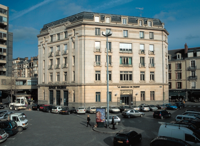 - PINTE Édifice de qualité architecturale élevée, associant les fonctions d'habitation rejetées sur la rue Jules-Simon et de Chambre de Commerce, avec une façade monumentale sur la place Honoré-Commereuc, grâce à une implantation en parcelle-îlot. L'architecte Y. Le Moine, qui s'est illustré par plusieurs réalisations de cette qualité, notamment avec l'immeuble Tomine ou encore l'immeuble de la rue Émile Souvestre, réalise ici une de ses oeuvres majeures. L'édifice constitue une des premières restructurations du coeur de la basse ville, initiée à la fin des années 20 par la halle construite sur les plans de l'architecte Emmanuel Leray, qui borde également la place.