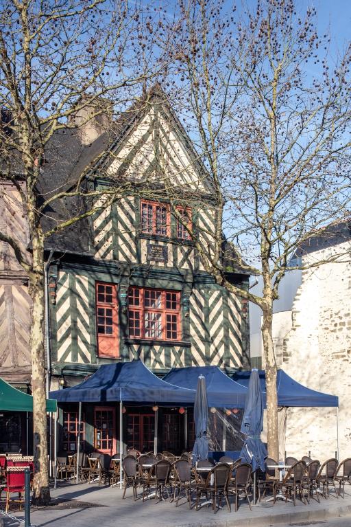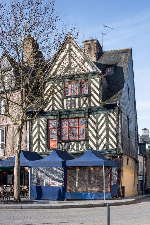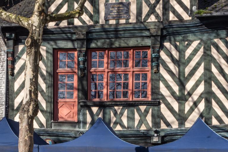 - PINTE Un des exemples les mieux conservés, en façade, des maisons de marchands du 16e siècle. Le niveau de rez-de-chaussée a été restitué lors des dernières restaurations. L'édifice est doté d'un comble rennais, aménagement du niveau de comble caractéristique des maisons à mur gouttereau sur rue, et d'une porte haute qui permettait d'introduire des objets volumineux à l'étage distribué par un escalier en vis. Cette maison, où habitait Leperdit, maire de Rennes jusqu'en 1823, a survécu aux alignements définis au milieu du 19e siècle et au moment de la construction de la nouvelle église Saint-Aubin. Elle s'inscrit dans un alignement de maisons en pan de bois qui illustre l'évolution de la typologie et de la mise en œuvre du matériau du 16e au 18e siècle.