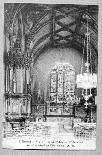 [1900 ca]. 8. Rennes (I.-&-V.) - Eglise St-Laurent (Intérieur). Autel et vitrail du XVIe siècle. Carte postale, A.B. édit., [s.d.] (A.D.35 : 6 Fi).