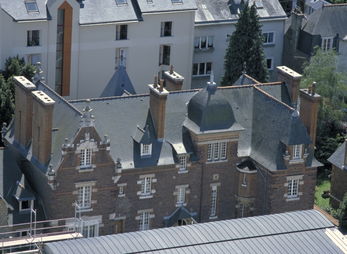 Rompant avec la richesse ornementale qui caractérisait sa production antérieure, Frédéric Jobbé-Duval réalise ici une oeuvre de transition où l´éclectisme savant a cédé place à un rationalisme pittoresque fondé sur l´emploi raisonné des matériaux. Si ce bâtiment peut marquer de manière symbolique l´entrée de l´architecte dans le 20e siècle, l´affirmation générale de la modernité de la façade, renforcée par l´emploi de matériaux nouveaux (le fer), pourrait répondre à la volonté des commanditaires. Réalisées pour des industriels, ces deux maisons jumelées n´affichent, en dehors de leur forte silhouette, aucun des archétypes de la demeure bourgeoise mais établissent un dialogue avec le bâtiment de l´usine située juste derrière et, par delà avec l´architecture ouvrière. Symbolisme patronal et paternaliste issu de la culture industrielle, influence du milieu architectural rennais ou des grandes figures de l´architecture contemporaine en Europe, le choix de ce parti ne semble en tous les cas pas anodin. L´oeuvre, parfaitement maîtrisée, n´en est que plus intéressante.