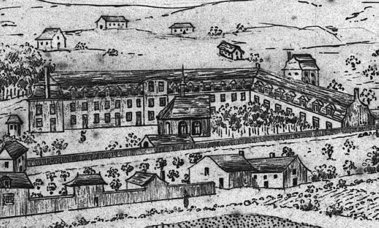 La reconstitution du 19e siècle donne une première représentation du sanitat, de plan en L, qui semble correspondre à son état après l'extension de 1657, mentionnée par Guillotin de Corson. La construction du canal qui relie l'hôpital à la Vilaine (actuel boulevard Sébastopol), constitue la deuxième étape de l'aménagement du site.