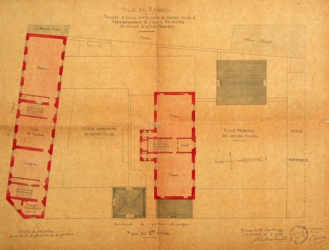 Projet d'école supérieure de jeunes filles et agrandissement de l'école primaire. Plan du deuxième étage, dessin, par Jean-Baptiste Martenot, 1886 (A. C. Rennes).