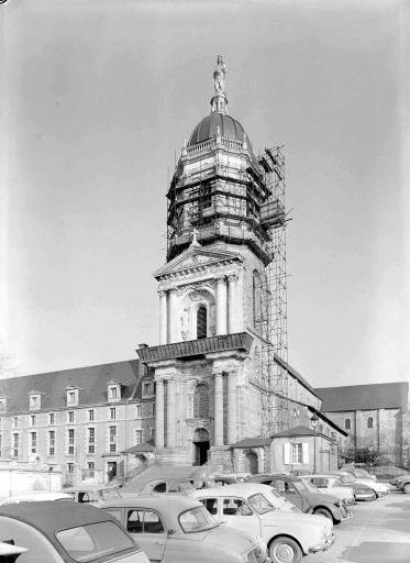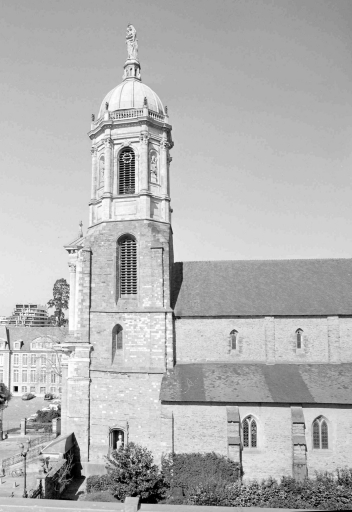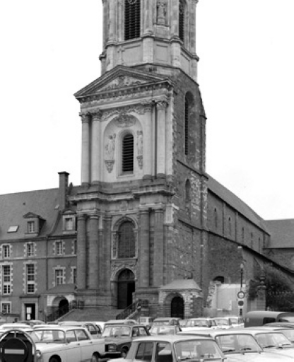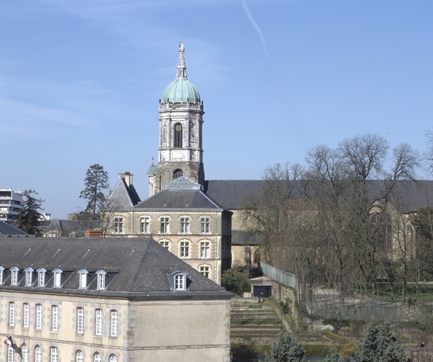 Une des principales abbayes, construites hors les murs à l'emplacement d'un ancien cimetière chrétien, à laquelle aboutit l'ancien faubourg (rue Saint-Melaine). Le palais abbatial, siège de l'évêché abritera le musée de la ville créé en 1794. Les jardins formeront le futur jardin public du Thabor. L' église primitive construite sur la tombe de saint Melaine, premier évêque de Rennes, fut incendiée vers le milieu du 7e siècle, puis reconstruite et de nouveau détruite au 10e siècle. L' église actuelle est un édifice dont les parties les plus anciennes (transept, bases de la tour du clocher) qui remontent à l' époque romane, sont l'oeuvre de Gervais, abbé de Saint-Melaine (1081-1109). Dans la 1ère moitié du 13e siècle le carré du transept est recouvert d' une voûte d' ogives (seul le départ de cette voûte est actuellement visible). Puis au 14e siècle les arcades de la nef et les fenêtres hautes sont refaites ainsi que le choeur et de nombreuses baies agrandies. De cette époque date aussi la loge seigneuriale (dont il ne reste plus que les ouvertures) située contre le mur nord du choeur. En 1432, la tour du clocher est reconstruite sur les bases romanes. En 1627 les mauristes s' installent à Saint-Melaine et se livrent à d' importantes modifications. En 1672 (daté par travaux historiques) le logis abbatial est reconstruit pour l' abbé Jean d' Estrades. En 1676, la façade du clocher est entièrement refaite en calcaire sculpté par l' atelier Corbineau qui réalise également en 1683 les galeries du cloître. En 1855, la tour du clocher, surélevée d' un étage supplémentaire par l' architecte Mellet, est couronnée d' une statue de la Vierge en plomb doré provenant des ateliers de l' abbé Choyer à Angers. L' église abbatiale est devenue paroissiale en 1791, regroupant d' anciennes paroisses supprimées dont Saint-Jean et Saint-Pierre en Saint-Georges. Elle est érigée en cathédrale provisoire de 1803 à 1844 sous le vocable de Saint-Pierre, puis elle redevient paroissiale à partir de 1844 sous le vocable de Notre-Dame. Une peinture murale du 15e siècle représentant le baptême du Christ est à signaler dans le transept sud. Une autre du 20e siècle d' André Muriel Bussy est visible dans le transept nord.