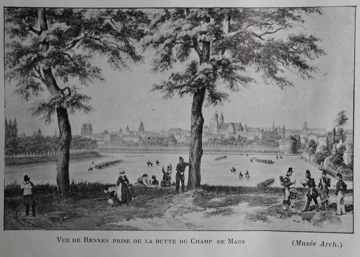 Vue de Rennes, prise de la butte du Champ de Mars, reproduction d'un dessin conservé au musée de Bretagne. In BANEAT, Paul. Le Vieux Rennes. Rennes : Plihon et Hommay, [1911].
