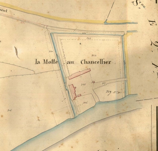 La première mention de la Motte-au-Chancelier est celle d´une vente en 1549 par Julien Botherel d´Apigné à Gilles Becdelièvre (Pocquet-du-Haut-Jussé, 1974). Le cadastre de 1844 représente, à l´est du manoir sur une section voisine une parcelle irrégulière, couverte par un bois, qui est probablement celle de la motte à l´origine du nom. La référence à un chancelier de l´époque ducale, de même que les toponymes proches du Moulin du Comte et du Garde-Robe (terre dont les revenus étaient alloués au chambellan) rappellent que cette fraction du territoire de la ville était anciennement aux comtes de Rennes puis aux ducs leurs successeurs à l´époque médiévale. La plus ancienne famille connue en possession de la Motte au Chancelier, celle des Botherel, seigneurs d´Apigné depuis le 13e siècle, famille passant pour être issue d´un ramage des anciens comtes de Rennes, est un indice supplémentaire de l´ancienneté du lieu.