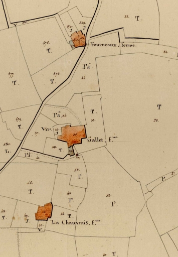 L´ancien manoir du Gallet ou des Gallets est situé au nord-est de la ville, à mi-pente du coteau de Coësmes, entre la route de Fougères et l´ancien chemin des Longchamps. Le cadastre de 1812, établi par nature de sol confond dans un lavis rouge uni les sols de cours et les bâtiments. Toutefois, une découpe curieuse, avec décrochement du côté de l´entrée principale de la cour, au sud trace d´un corps d´entrée, le portail du manoir mentionné dans des actes du 17e siècle avec ses deux colombiers. Un autre décrochement est visible à l´ouest correspond à l´ancienne chapelle du manoir signalée en ruines au cours du 18e siècle. Cette dernière, pourvue d´un clocher et accostée d´un cimetière au sud semble avoir servi de succursale de paroisse pour ce secteur très éloigné de sa paroisse, Saint Pierre en Saint-Georges, ainsi que de l´ancienne église Saint-Laurent des Gayeulles. Ces deux éléments du manoir ont du disparaître dans la première moitié du 19e siècle ; ils ne figurent plus sur le cadastre de 1842. Ce plan représente à peu près l´état dans lequel l´édifice nous est parvenu : le logis occupe le nord de la cour, les communs, en grande partie rebâtis vers 1830 forment une équerre disjointe à l´est et au sud.