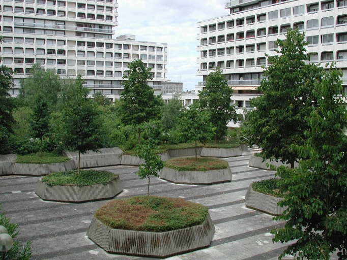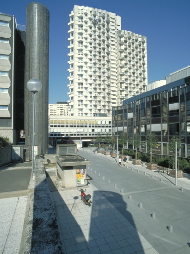 La place piétonne qui constitue, en théorie, un pôle fédérateur est un espace minéral et froid, en raison des courants d'air. Une rénovation récente l'a dotée de chemins de planches et de fontaines.