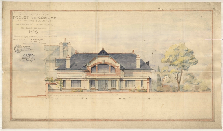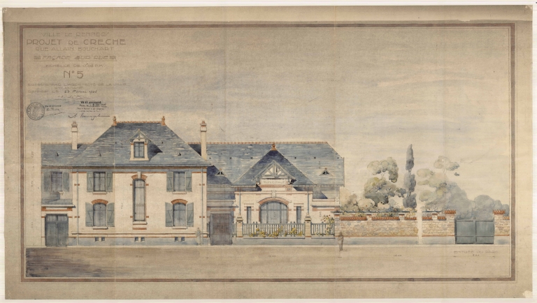 Depuis la fin du 19e siècle, la France développe une politique hygiéniste qui se traduit notamment par la construction de piscines, bains-douches et de crèches. La municipalité rennaise fait ainsi construire quatre crèches de 1902 à 1934, dont celle de la rue Alain-Bouchard, la troisième construite par la ville. Le choix du terrain est particulièrement judicieux puisque le bâtiment se trouve à côté d´un parc et d´une école de filles, tous deux récemment construits. De plus, la population ouvrière des habitations à bon marché situées près de la rue de Nantes peut ainsi disposer d´une nouvelle crèche qui manquait dans ce quartier populaire en plein essor situé entre la voie ferrée et le boulevard Jacques-Cartier.