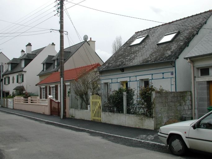 Plan masse : lotissement formé de 47 lots desservis pas une voie nouvelle. Implantation du bâti : en retrait. Position des jardins : en fond de parcelle. Typologie du bâti : maisons élémentaires en rez-de-chaussée et à étage.