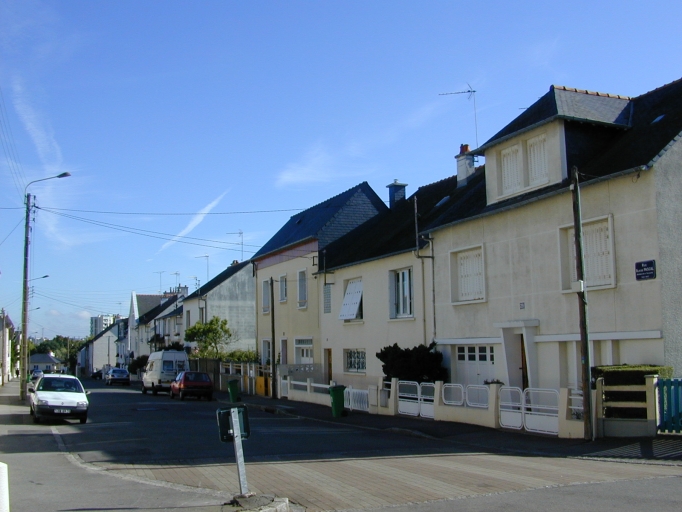 Plan masse : lotissement actuellement formé de 159 lots desservis par cinq rues nouvelles, par une voie aménagée sur le tracé de l'ancienne ligne de tramay (rue Blaise-Pascal) et une voie primaire existante (rue de Vern). Implantation du bâti : en rangée rectiligne continue et discontinue, à l'aplomb de la voie (rues Albert-Thomas et Docteur-Calmette), en retrait (rues Eugène-Quessot, Blaise-Pascal et Carle-Bahon). Position des jardins : en fond de parcelle. Typologie du bâti : maisons élémentaires, maisons d'étage, maisons à garage dans oeuvre, maisons en série, maison à boutique. De nombreuses transformations ont eu lieu à la fin des années cinquante et dans les années soixante.