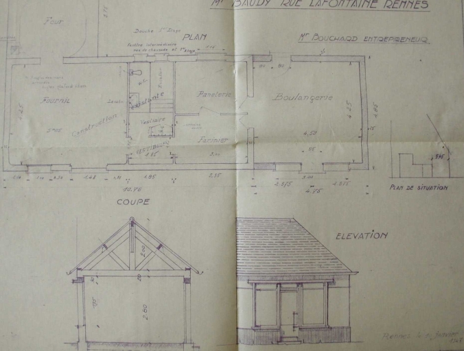 M. Baudy. Fournil et boutique. Plans et élévations, tirage de plan, 1955 (A. C. Rennes).