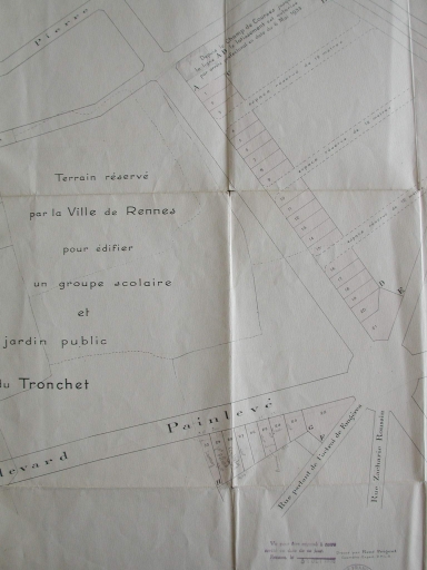[1935]. Lotissement face au jardin public du Tronchet. M. le marquis de Kernier propriétaire, dessin, par René Prigent géomètre, 10 avril 1935 (A. C. Rennes).