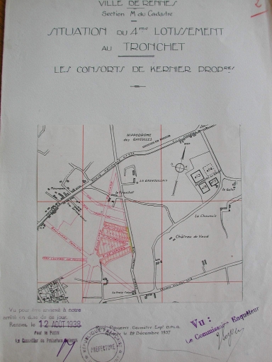 [1938]. Ville de Rennes. Section M du cadastre. Situation du 4e lotissement au Tronchet. Les consorts de Kernier propriétaires, dessin, par René Prigent géomètre, 1938 (A. C. Rennes).