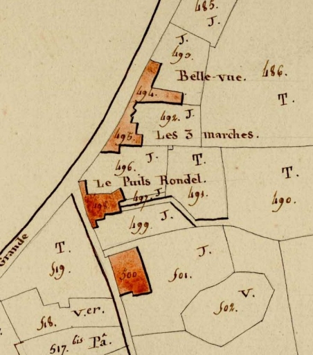 La terrasse qui rachète la pente du sol de l´ancienne cour et conduit vers la pièce d´étage du pavillon est un vestige de l´ancien jardin clos qui surplombait le chemin. Ce jardin a été séparé de la propriété vers 1900, lors du percement de la rue Maupertuis. L´ancien mur sur la rue d´Antrain, construit en schistes pourpres et rythmé par quatre contreforts sert actuellement de soutènement au jardin de la maison du 1 rue Maupertuis. Lors du nouvel alignement de 1855, le rez-de-chaussée du pavillon a été doublé sur la rue par un ajout en pan coupé surmonté d´une terrasse formant belvédère.