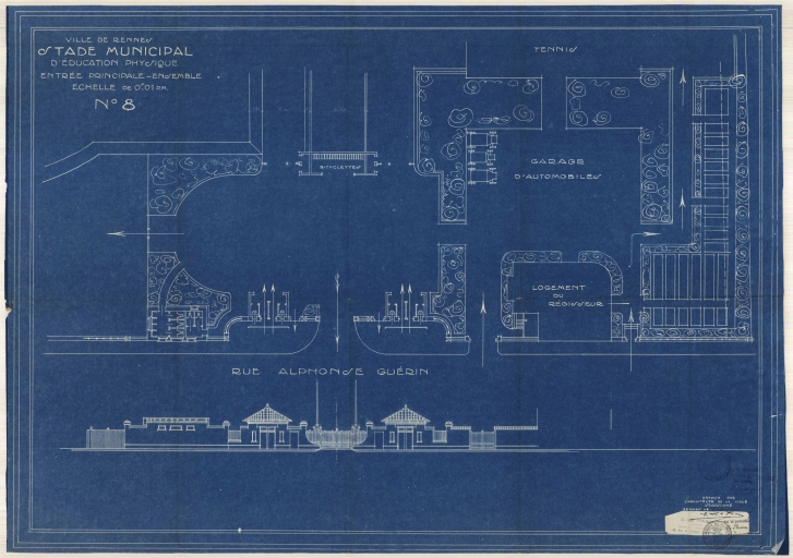 Le devis, établi en 1922 par l´architecte communal E. Le Ray, prévoit la construction d´une grande piscine (actuelle piscine Saint-Georges), finalement construite rue Gambetta, de bains-douches et de terrains de jeux. A l´ouest du terrain, un logement de concierge, un deuxième court de tennis et huit cabines de douches près des vestiaires doivent occuper l´emplacement initialement prévu pour la piscine. Un kiosque à musique et une buvette complètent l´ensemble des installations.