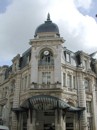Journal Ouest Eclair fondé en 1899 par deux catholiques républicains, Félix Trochu, prêtre d'Ille-et-Vilaine et un avocat, Emmanuel Desgrées du Lou, aidés de quelques amis, tous engagés dans le combat social. L'objectif de l'Ouest Eclair suit un engagement pour la lutte et la justice traduite dans l'Encyclique de Léon XIII portant sur la condition des ouvriers à l'époque d'une industrialisation intense. Le 2 août 1899, 1 800 exemplaires du premier numéro sont tirés. En 1909, construction, par l'architecte Eugène Guillaume, de l'imprimerie du journal républicain, actuelle rédaction locale du journal régional Ouest France. En pleine prospérité, l'Ouest Eclair développe ses éditions en direction du Finistère, puis vers la Normandie, le Maine et les Pays de la Loire. Plusieurs campagnes de construction se succèdent en 1912, 1913 et 1915. En 1925, l'Ouest-Eclair, répandu dans 12 départements de l'Ouest, tire chaque matin 250 000 exemplaires. Le 22 janvier 1926, constitution, par Paul Desgrées du Lou, de la SA la Presse Rennaise au capital de 25 000 f. Cette société a pour objet l'exploitation d'un journal traitant de sujets politiques, littéraires, scientifiques, religieux, économiques et d'annonces. Le 30 septembre 1944, création de la société anonyme d'Editions Ouest-France au capital de 392 000 f. En 1949, l'architecte Chouinard entame une campagne de construction. En 1950, un atelier est surélevé. En 1971, l'activité principale concerne l'édition de journaux et exerce, comme activité annexe, l'imprimerie. La superficie totale du journal Ouest-France couvre 4800 m2 à Rennes et 105 545 m2 à Chantepie, banlieue sud de Rennes. En 1991, Ouest France décentralise sa fabrication. Le premier quotidien français installe sa septième rotative à La Chevrolière, près de Nantes (44). Aujourd'hui, Ouest France est toujours actif. En 1911, mention d'une chaudière à vapeur construite par MM. Winkler, Fallet et Cie, à Berne (Suisse). En 1971, Le matériel de production comprend, pour la composition programmée, 10 élektrons, 2 monarchs, 2 IBM 360 205 ; pour la photocomposition, 2 lumitypes ; pour la composition traditionnelle, 54 linotypes et pour limprimerie 32 rotatives. En 1991, le matériel utilisé à Nantes est le même qu'à Rennes : une rotative offset suédoise Minners Nohab grande largeur d'une capacité de production de 65 000 exemplaires de 56 pages à l'heure avec 12 pages quadri. En 1971, Ouest-France emploie 1583 personnes.