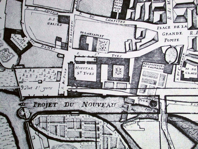Selon Guillotin de Corson, l'hôtel-Dieu, dit hôpital Saint-Yves, est fondé en 1358 par un prêtre du diocèse de Tréguier. En 1557, il est réuni à l'hôpital Sainte-Anne. En 1583, il compte 82 lits, dont 34 dans la vieille salle, 40 dans la nouvelle salle et trois chambres de femmes. En 1628, l'hôpital est à nouveau agrandi de nouvelles salles des malades, à l'ouest de la cour. En 1630, il acceuille 220 pauvres. En 1728, il abrite grenier à blé et caves à cidre des hôpitaux de Rennes. Desservi par les Hospitalières de la Miséricorde, entre 1644 et 1792, il sera désaffecté après la construction du nouvel hôtel-Dieu, au milieu du 19e siècle. Selon le dossier établi en 1996 par Véronique Orain, la chapelle, construite en 1494, remplace un édifice du 14e siècle, dont des vestiges semblent subsister dans l'appareillage du mur nord de la nef. L'édifice, dont la vue de 1616 donne une première représentation, présente une disposition à cour centrale bordée au nord par la chapelle et à l'ouest par un corps de bâtiment qui se prolonge jusqu'à la rivière de la Vilaine, à l'est de la voie qui mène à la porte Aivière. Un terrain figuré comme une pâture ou un verger lui fait face, à l'ouest de la rue. Le plan de 1685 montre qu'il s'appuie sur le rempart de la première enceinte. Le plan de 1726 (doc. 1), plus précis, montre que la cour est accessible depuis la rue et que le corps de bâtiment qui s'élève à l'ouest de la cour est doté d'un corps de passage enjambant une rampe menant à la rivière. Le cimetière est visible, à l'ouest de la rue. Le plan figure une deuxième cour, à l'est, et des jardins. Comme le montre le plan de 1877, l'édifice est partiellement détruit pour permettre la rectification des quais bordant la Vilaine.