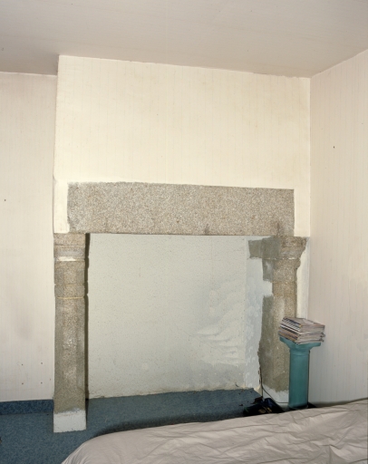 Contre le pignon ouest, la cheminée légèrement saillante présente des jambages verticaux à l´aplomb du manteau, modèle assez rare du début du 16e siècle. Le pignon est de cette salle n´a jamais reçu de cheminée. L´escalier droit actuel qui rampe le long du mur arrière ne date que du début du 20e siècle. Selon toute vraisemblance, l´escalier d´origine, une vis en bois, faisait face à la porte d´entrée, la fenêtre dans l´axe de celle-ci éclairait son départ. Cet escalier devait ressembler à celui conservé dans l´ancien logis du Grand-Tertre en Thorigné : la vis y démarre le long du mur puis l'extrémité des marches suspendues est fermée par des panneaux qui forment une cage jusqu'au plafond.