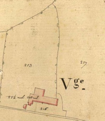 L'édifice est visible sur le cadastre de 1812 qui donne une représentation confondue des bâtiments et de la cour. Le cadastre de 1842 figure un corps de bâtiment de plan en L, avec un appentis postérieur et un four, au sud-ouest de la cour antérieure ouverte.