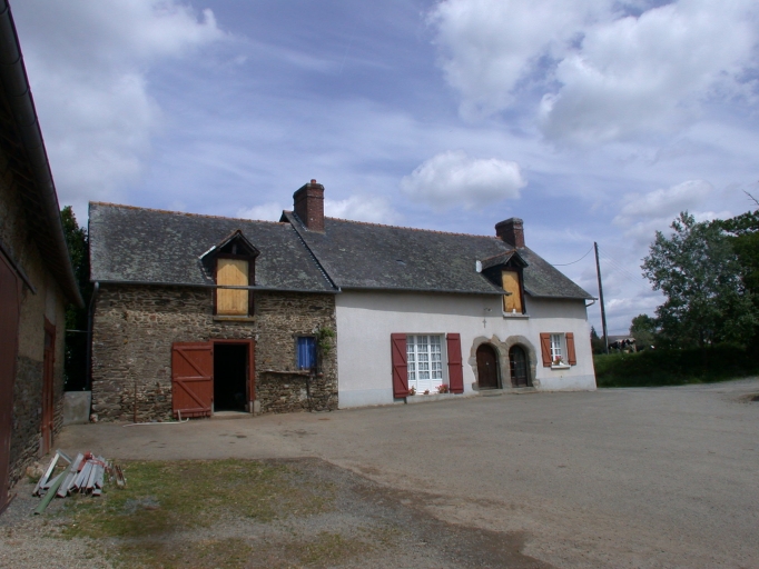 Plan allongé. Parti bas. Porte double.Logis en moellons de schiste. Etables avec partie haute en terre. Appentis arrière.