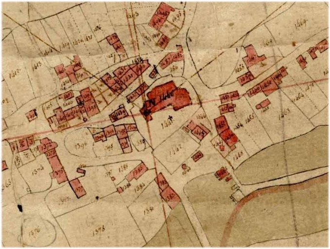 Plan géométrique parcellaire de la commune d'Acigné, section E4 dite du Bourg. Plan par Beuscher ainé, 1819, échelle 1/2500e. (A. D. d'Ille-et-Vilaine : 3 P 5234).