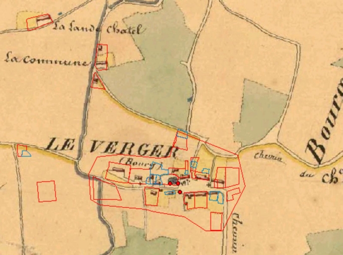 Plan géométrique parcellaire de la commune du Verger, section B2 dite du Bourg, levée par le géomètre Dupit en 1845, échelle 1/2000e (A. D. d'Ille-et-Vilaine : 3 P 5575).