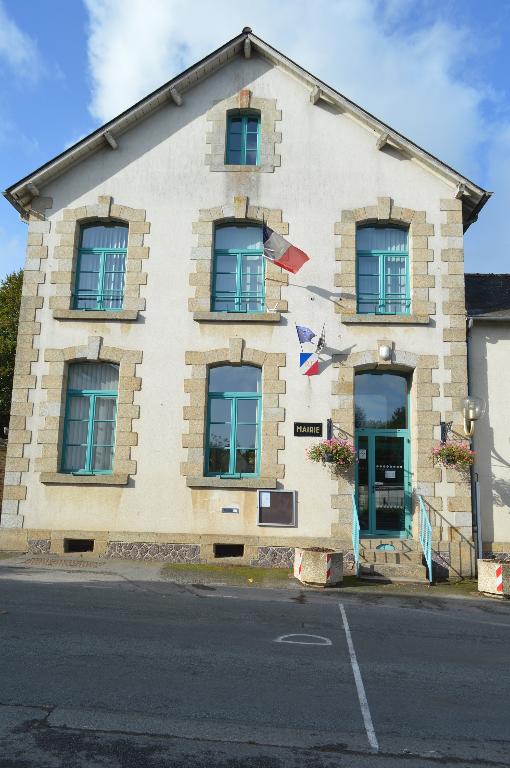 La mairie occupe le bâtiment principal, qui est divisé en trois travées de trois niveaux. Le bâtiment repose sur un soubassement en poudingue, percé de deux soupiraux encadrés de granite. L'accès au bâtiment se fait par un perron de quatre marches bordées de rampes en fer. Sur la façade principale les chaînes d'angle, les appuis, les chaînages des jambages et les claveaux des ouvertures avec leurs clefs sont en granite. Les chaînes d'angle et les encadrements des ouvertures sont en brique sur la façade arrière. Toutes les ouvertures sont surmontées d'un arc segmentaire. Le bâtiment est coiffé d'un toit en bâtière à deux longs-pans. Les corbelets sont dotés d'un profil en quart-de-rond.