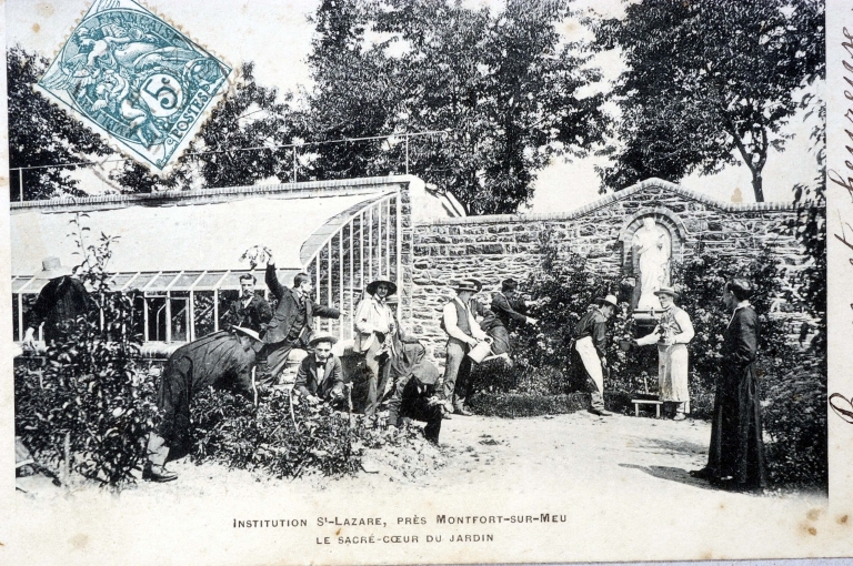 Carte postale ancienne. Montfort-sur-Meu. Institution St-Lazare, Le Sacré-Coeur du jardin. Phototypie A. Breger frères, Paris. Vers 1904. (Ecomusée du Pays de Montfort).