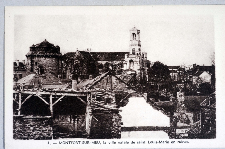 Carte postale ancienne. Montfort-sur-Meu. La ville natale de Saint Louis Marie en ruines. (Ecomusée du Pays de Montfort).