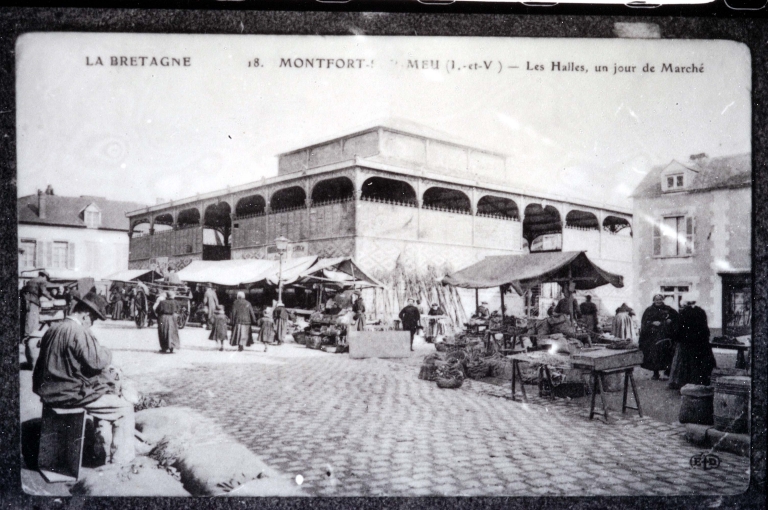 Carte postale ancienne. Montfort-sur-Meu. Les Halles. E. Mary Rousselière, éditeur, Rennes. Vers 1904. (Ecomusée du Pays de Montfort).