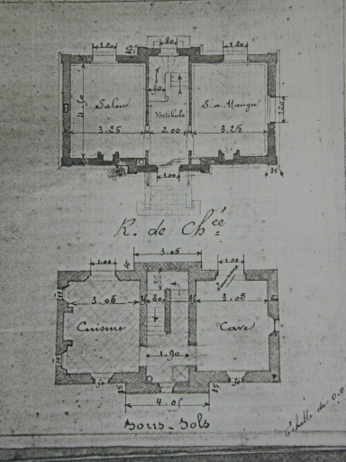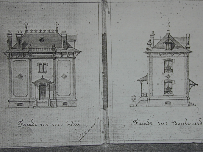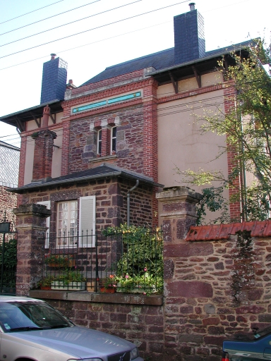 Cette maison est construite en moellon de schiste et de poudingue enduit. Le toit à croupes est couvert d'ardoise et possède un coyau. Les chaînages d'angle, les frises, les encadrements de baies et les souches de cheminées sont en brique. Les deux façades possèdent une travée centrale en avancée, celle de la façade arrière se termine par un fronton triangulaire. Par ailleurs, la façade sur rue présente un décor de céramique.