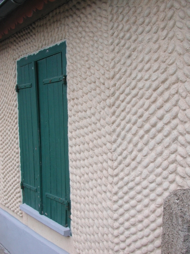 Les murs gouttereaux de cette construction sont élevés en torchis recouvert d'un enduit, alors que les murs pignons sont en moellon de schiste et de poudingue. L'enduit de la façade est particulier car il représente une multitude d'oves. Le toit est couvert d'ardoise et percé d'une lucarne centrale. Les encadrements de baies sont en bois.