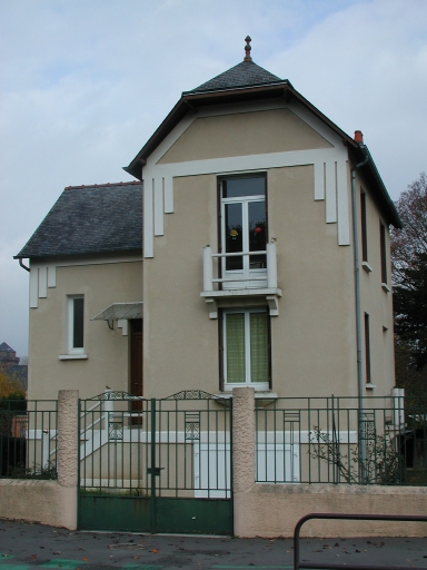 Cette maison possède des murs enduits et un toit à demi croupes couvert d'ardoise. La grille du portail ainsi que le décor de la façade sont de style Art Déco.