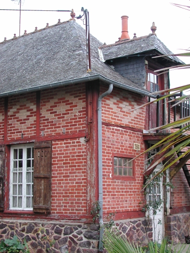 Cette maison est élevée en brique sur une ossature de bois. Le toit à croupes est couvert d'ardoise et possède des épis de faîtage en terre cuite. De plus, il existe une porte haute pendante à croupe débordante dans le pignon sud.
