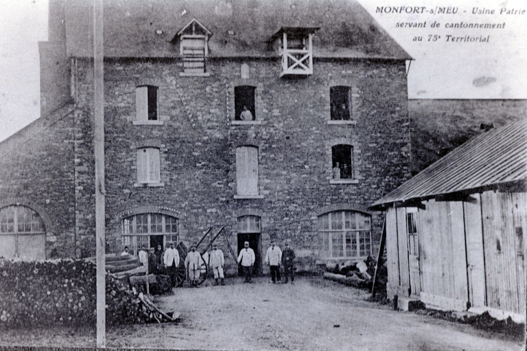 Carte postale ancienne. Montfort-sur-Meu. Usine Patrie servant de cantonnement au 75e Territorial. (Ecomusée du Pays de Montfort).