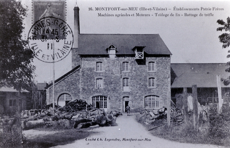 Carte postale ancienne. Montfort-sur-Meu. Etablissements Patrie Frères. Machines agricoles et Moteurs. Teillage de lin. Battage de trèfle. Cl. Ch. Legendre, Montfort-sur-Meu. (Ecomusée du Pays de Montfort).