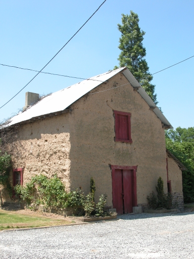 Ancien logement en poudingue en pierre de taille, moellons de schiste et maçonnerie en terre ; portes géminées en plein cintre.