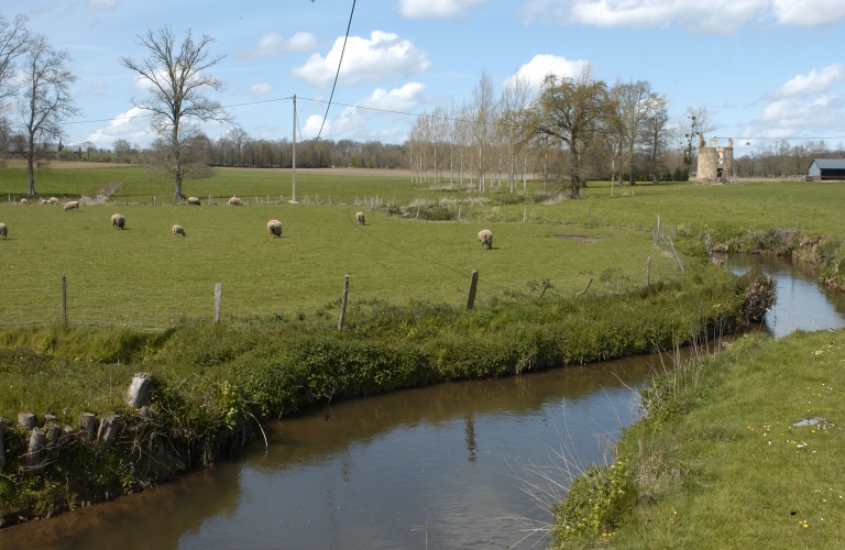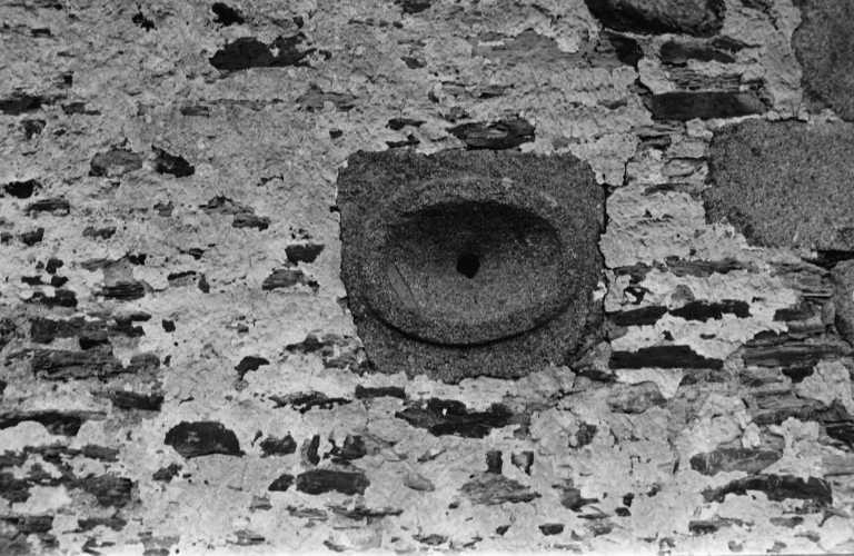 Vestige : tour de plan circulaire à un étage ; toit conique ; présence d'une bouche à feu.
