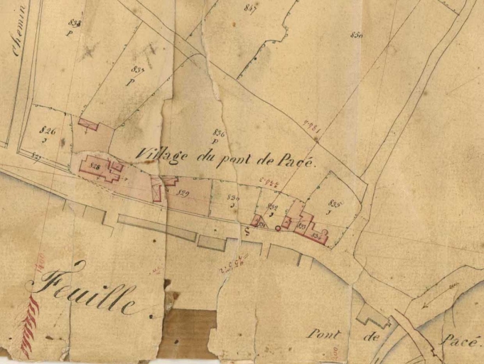 Plan géométrique parcellaire de la commune de Pacé, section F1 dite du Bourg, levé par le géomètre Augier en 1851, échelle 1/2000e (A. D. d'Ille-et-Vilaine : 3 P 5437).