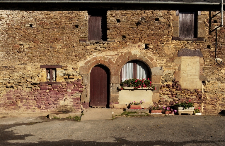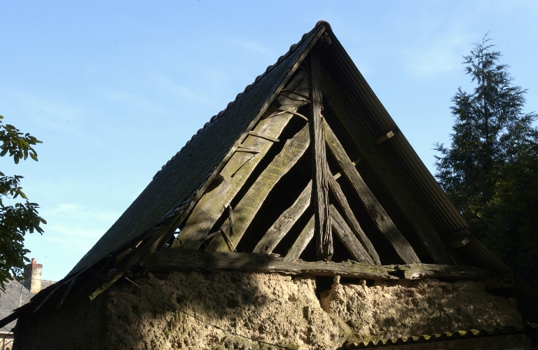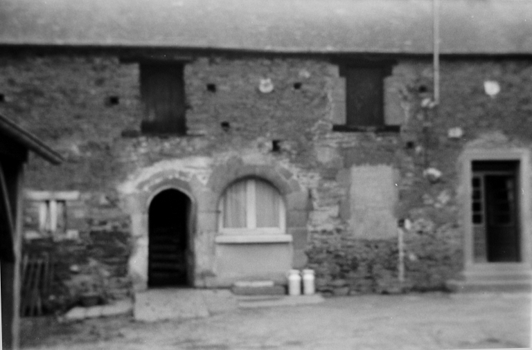 Le mur Est du logis est construit en moellons de schiste, réparé en moellons de poudingue pourpre, les trois autres murs sont en terre sur soubassement en pierre.