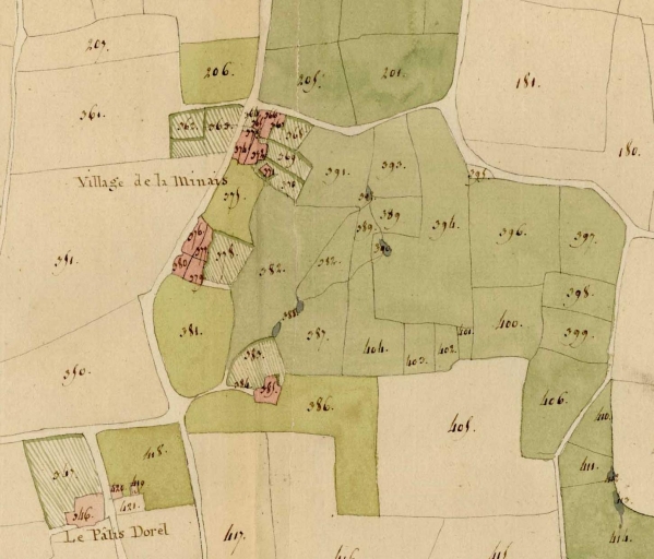 Figurée sur le cadastre de 1810 au village de la Minais aujourd'hui disparu. Ferme ou manoir (?) pouvant remonter au 16e ou début 17e siècle. Il s'agirait alors d'un manoir à salle basse sous charpente constitué d'une grande salle avec aux deux extrémités : une cuisine (à l'Est) et un cellier (à l'Ouest). Présence d'une chambre à l'étage (?) comme pourrait l'indiquer une baie perçée dans le pignon Ouest et dotée d'une grille. Déclassement du manoir en ferme au 18e siècle entraînant une surélevation pour accroitre les capacités de stockage. Grand cellier arrière construit dans la 2e moitié du 19e siècle.