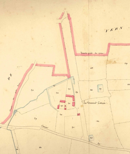 Figurée sur le cadastre de 1850. Ferme pouvant remonter au 18e siècle, agrandie au 19e siècle et remaniée au 20e siècle. Ancienne métairie du manoir du Grand Corcé.
